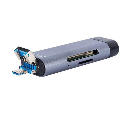 Novedoso Lector de Memorias con conexión USB / micro USB en un extremo y conexión USB Type-C en el otro. Soporta Tarjetas SD y TF de hasta 512GB. Diseño ultra compacto construído en aluminio. Incluye capuchones de seguridad.