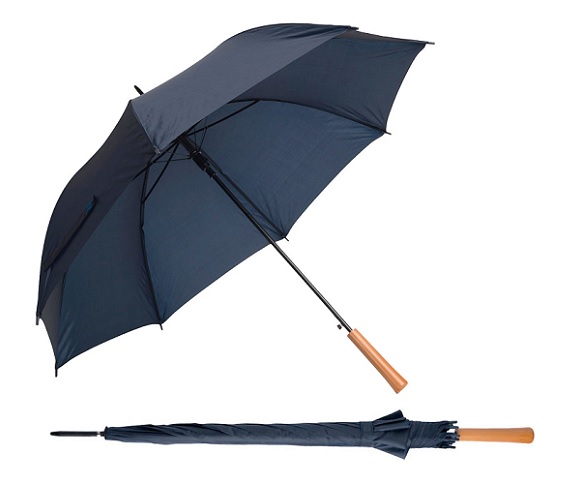 Ø 118 cm. Poliéster. Paraguas APERTURA AUTOMÁTICA Y CIERRE MANUAL. Eje, varillas y punta metálicas, cierre con correa de velcro y mango en PVC, símil madera. Stock: 2 unidades disponibles.