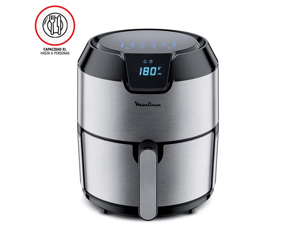 Modelo: EZ401D10. La solución saludable para fritos crujientes todos los días. Capacidad XL: gran capacidad de 4,2 litros perfecta para comidas para hasta 6 personas. Un ideal formato para familias numerosas u ocasiones especiales con amigos. Sin aceite: una freidora saludable que ofrece resultados dorados y crujientes con poco o sin aceite. Platos más saludables y con todo el sabor. Potencia: 1500 W. Temperatura ajustable: rango de 80 a 200 ºC. Pantalla digital: Cuatro modos de cocción: Freir, Rostizar, Asar y Cocinar. Ocho programas preestablecidos que ofrecen una gran variedad de elaboraciones de la forma más fácil y rápida. Temporizador: temporizador electrónico de 60 minutos, se apaga automáticamente. Revestimiento antiadherente: permite que los alimentos no se peguen en la freidora. Tecnologíalogía Air Pulse: el flujo de aire caliente circula de forma ciclónica, haciendo que los ingredientes queden crujientes por fuera. Fácil de limpiar: partes extraíbles aptas para el lavavajillas. Medidas: altos 33,3 x ancho 33,8 cm.