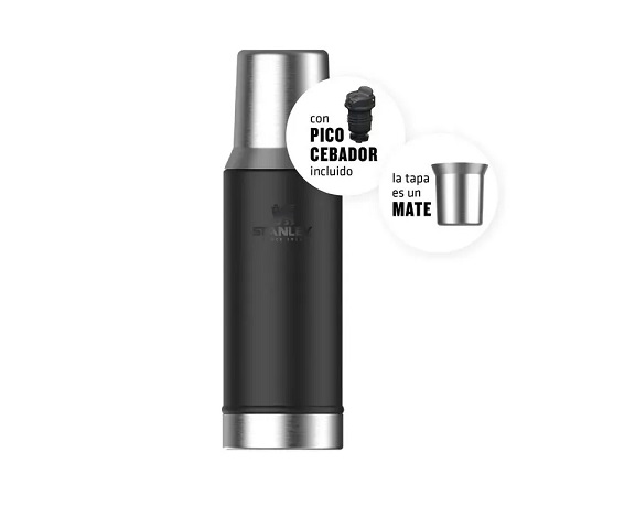 Compañero ideal para el mate. Con tecnología exclusiva, este termo cuenta con un tapón de altísima precisión que permite verter el agua directamente en el punto deseado para una cebada perfecta y con fluido continuo. La tapa de acero inoxidable se convierte en un mate para que puedas disfrutar de la bebida en cualquier lugar. Además, el Termo Stanley Mate System mantiene tu agua a la temperatura ideal para que puedas disfrutar de tu mate caliente por más tiempo. Mantiene las bebidas frias y/o calientes por 22 hs. Medidas: alto 29,5 cm x ancho 9 cm.